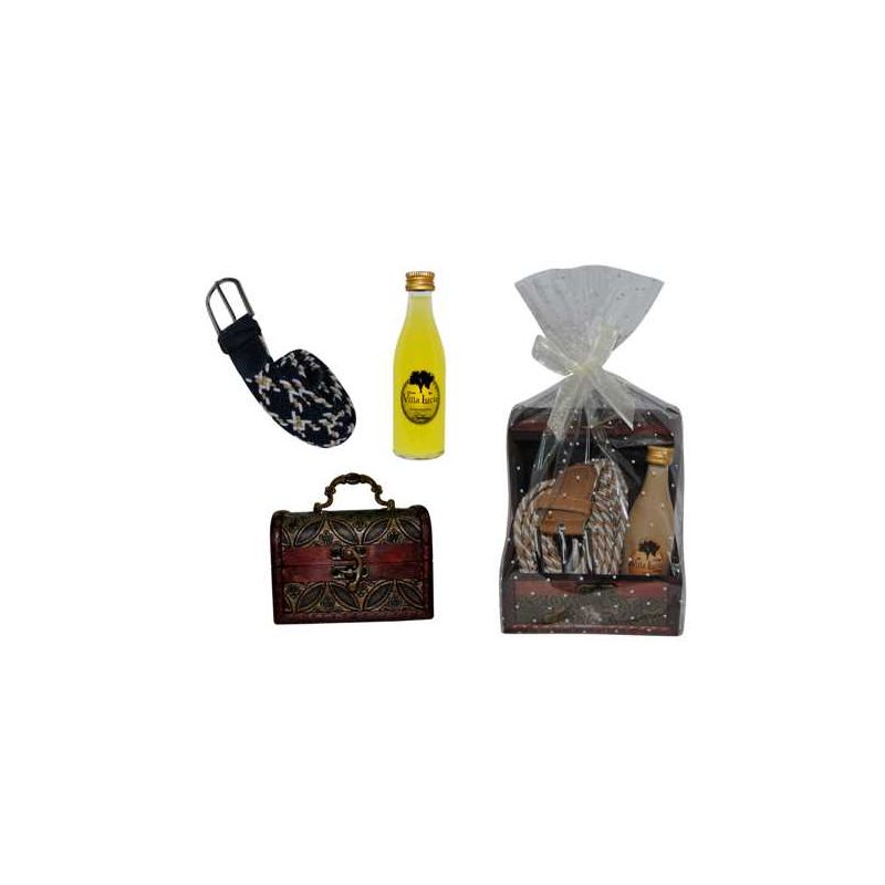 Licor V-caramelo con chupito en bolsa moto, gourmet.