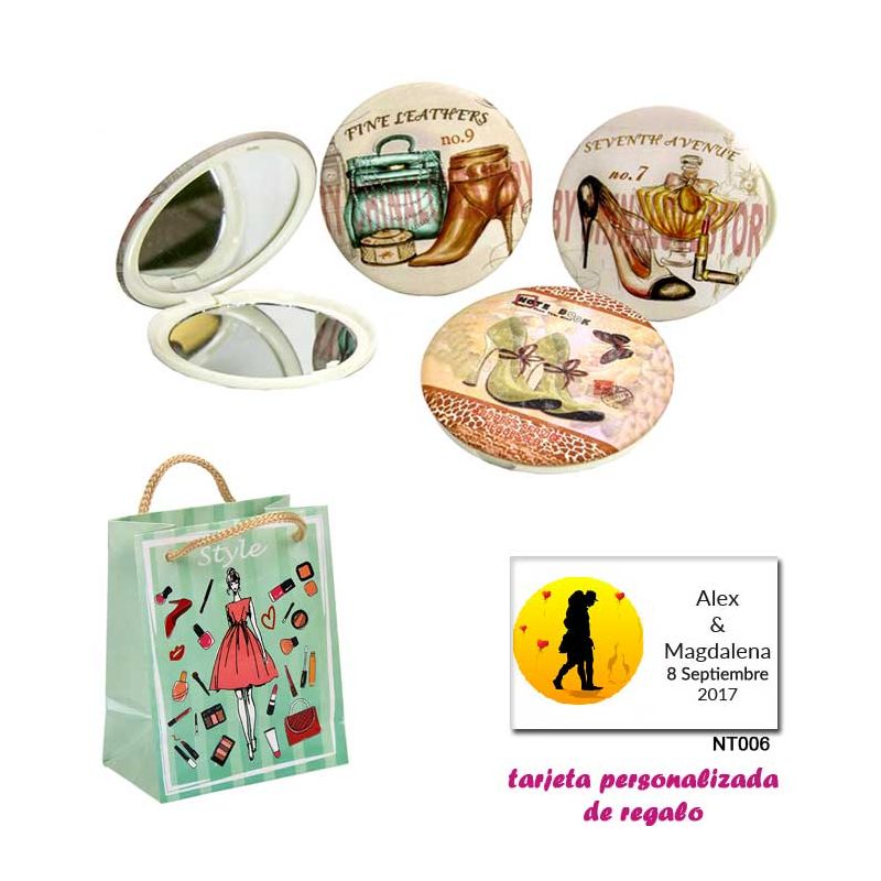• Espejo con sombrilla y niños, con bolsa de lunares de color rosa, y tarjeta personalizada