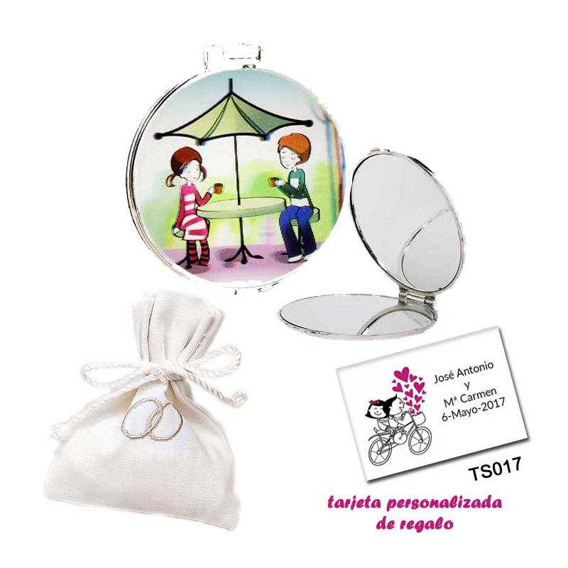 Espejos plateados con cuadros escoceses, con bolsa blanca de organza, y tarjeta personalizada