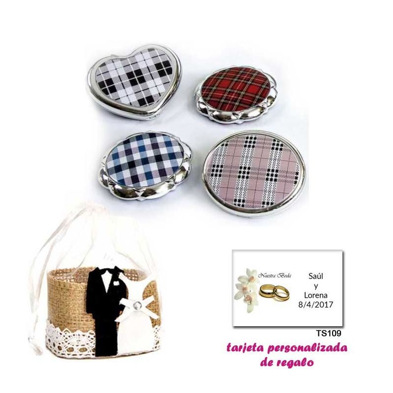 • Espejo con una elegante novia con velo, con caja de acetato con lazo morado de lunares y tarjeta personalizada