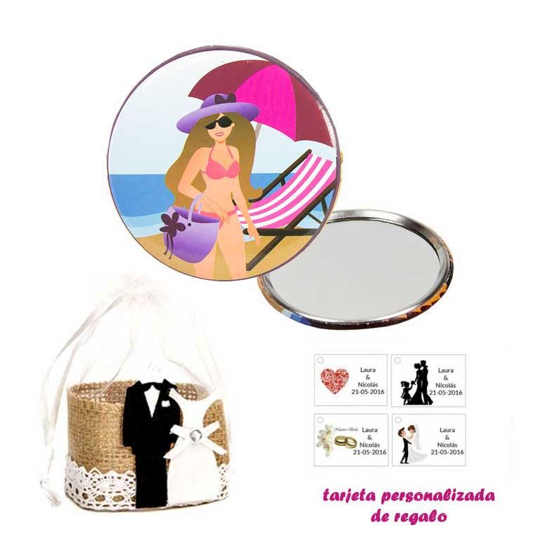 • Espejo de Chapa con chica en la Playa, con caja de flores y lazo azul, y tarjeta personalizada