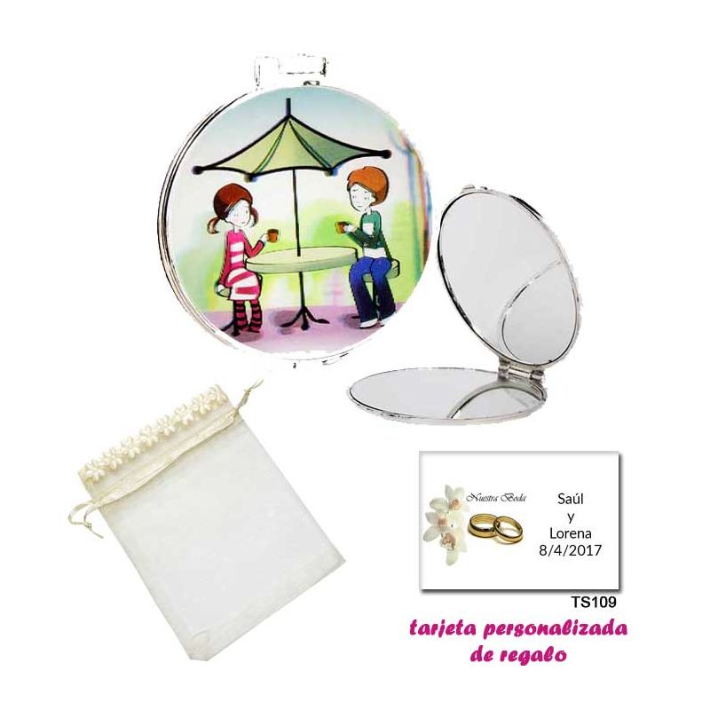 • Espejo de Chapa con chica en la Playa, con bolsa de saco marrón y tull, y tarjeta personalizada
