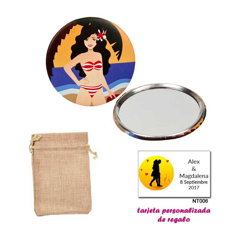 • Espejo plateado con una flor grande, y con un peine en el interior, con dibujos de mujer, perfume y belleza, y tarjeta personali