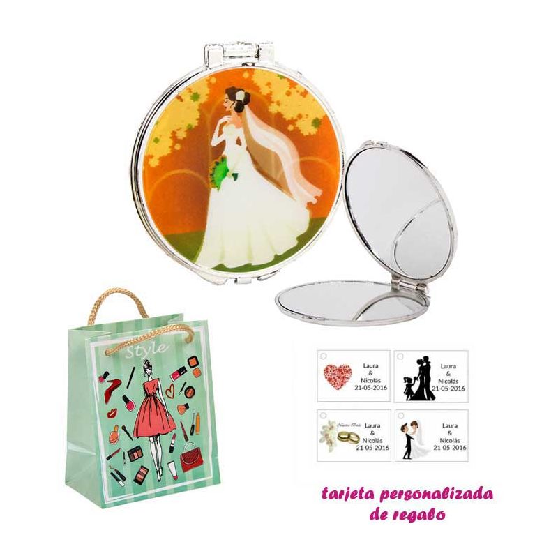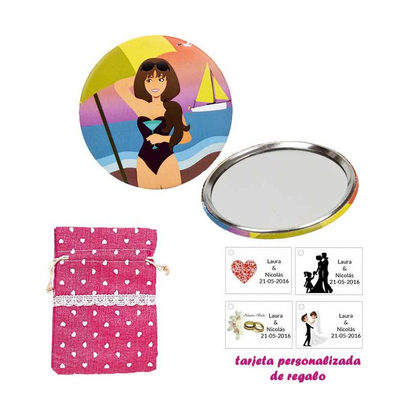 • Espejos vintage con motivos de ciudades, con dibujos de mujer, moda y belleza, y tarjeta personalizada