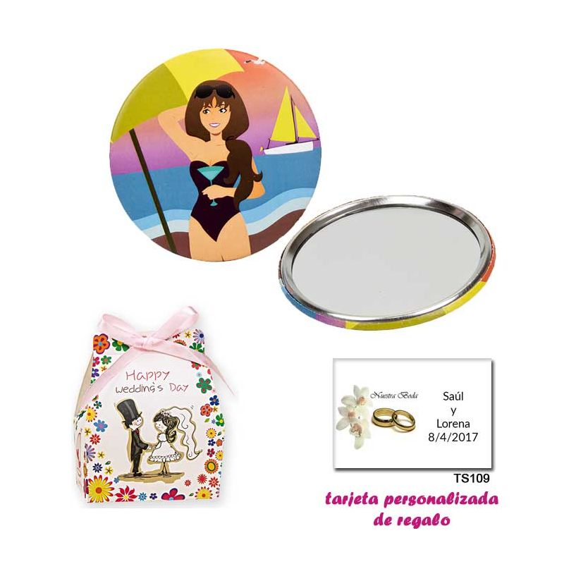 Espejos coloridos con búhos, de diferentes formas, con bolsa blanca de organza, y tarjeta personalizada