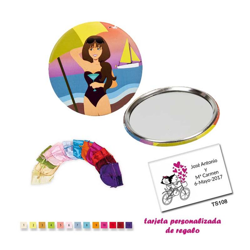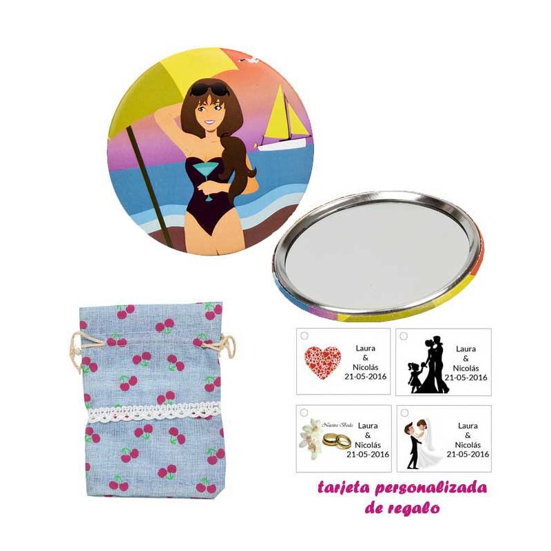 Espejos coloridos con búhos, de diferentes formas, con bolsa de organza con flores en el filo de color beige, y tarjeta personalizada