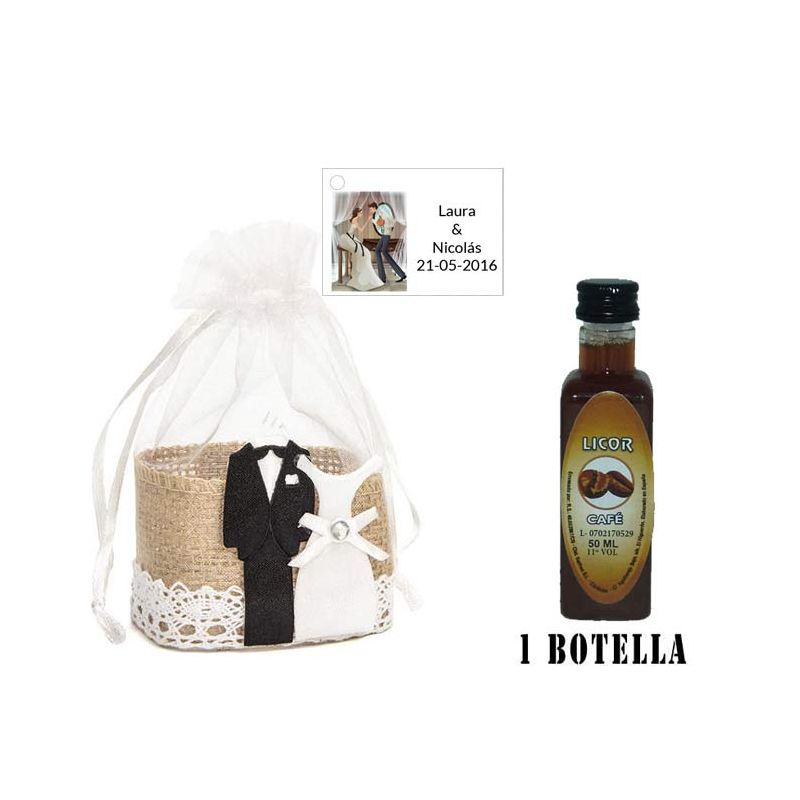 • Detalle de boda licor en baúl con bolsa y tarjeta