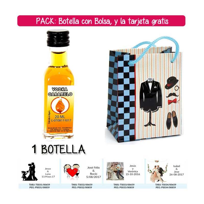 2 Botellitas Petaca de Vodka Caramelo con bolsa “con moto roja” y tarjeta