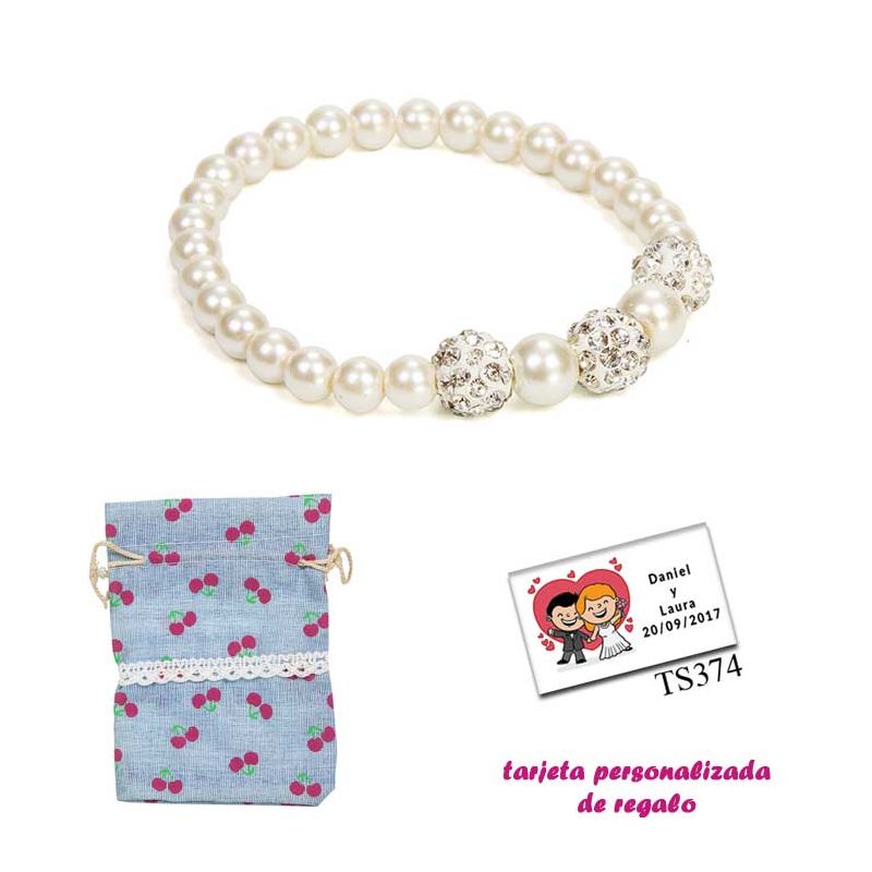 Pulsera de perlas blancas y abalorios con brillantes, y un colgante de elefante