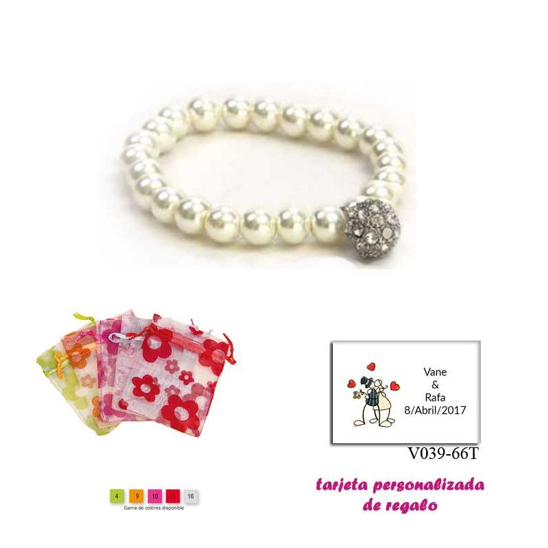 Pulsera de perlas blancas y abalorios con brillantes, y un colgante de elefante