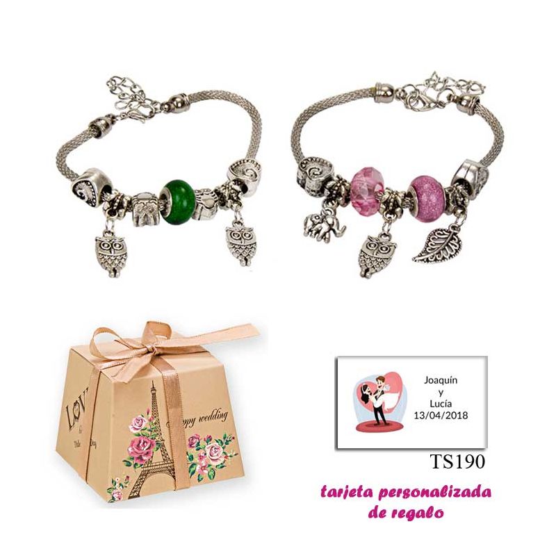 Pulsera con abalorios en colores surtidos (verde o rosa) y colgantes de búhos y elefantes