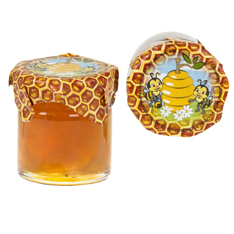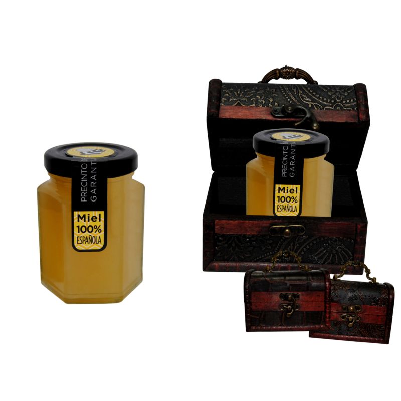 Bote de miel en caja de mimbre para detalles de boda.Tarro de miel de 150gr para detalles de bodas.