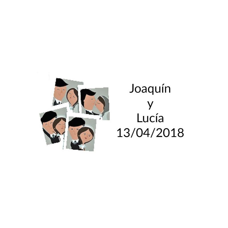Tarjetita de boda novios con bombones en la que aparece un dibujo de los novios, los nombres y fecha escrito en la tarjetita de boda.