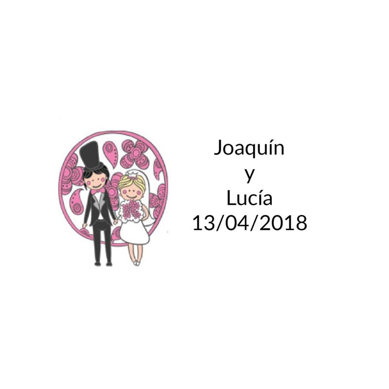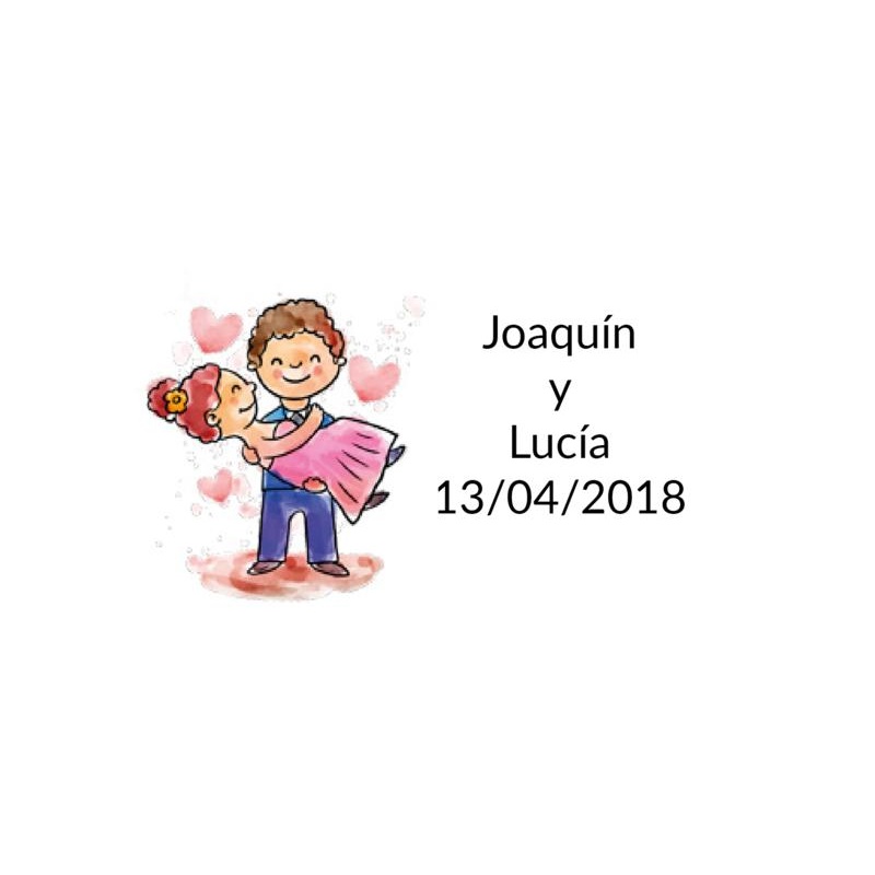 Tarjetita de boda con novios a bajo precio en la que aparece un dibujo de los novios, los nombres y fecha escrito en la tarjetita de boda.
