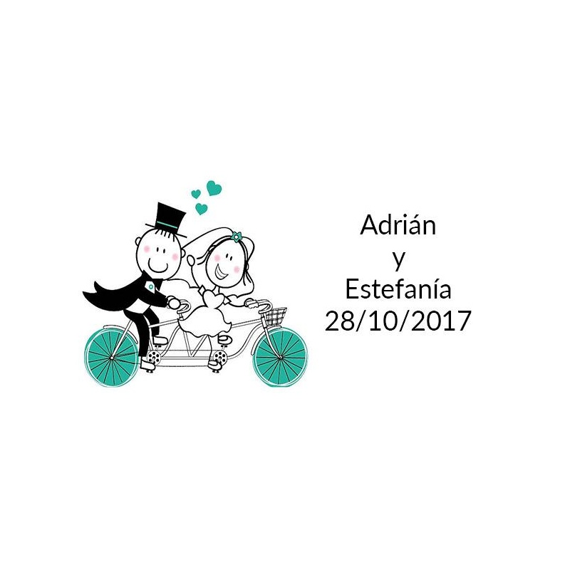 Tarjetita de boda para adornar los regalos de boda en la que aparece un dibujo de los novios, los nombres y fecha escrito en la tarjetita de boda.
