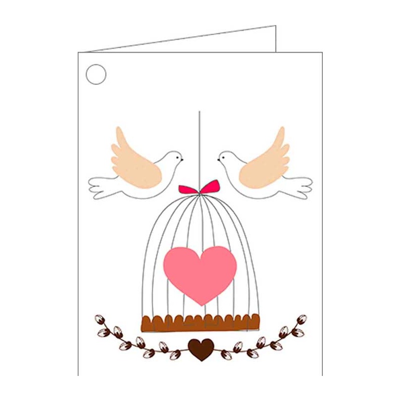 Tarjetita de boda corazón para detalles de boda en la que aparece un dibujo de los novios y un corazón, los nombres y fecha escrito en la tarjetita de boda.